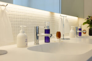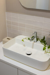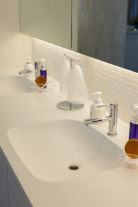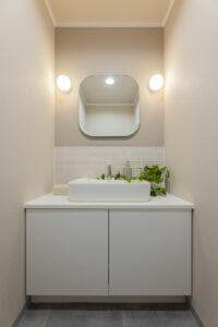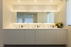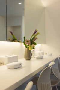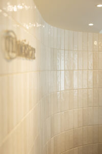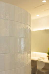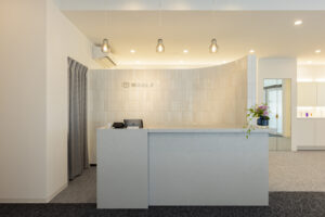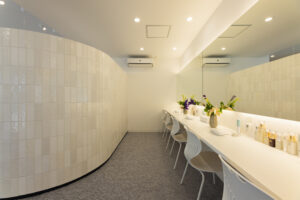 美肌美容サロンという店舗の性質上、シンプルでありながらも清潔感や品が感じられる場が求められた。そこでお店の顔として店舗内中心に位置する「受付カウンター」には、カーブを描いた間仕切り壁にエレガントなタイルを貼ることを提案した。その他にもトット建築オリジナルでデザインから製作まで一貫して行っている「4mを超える人工大理石一体成型の洗面台や造作カウンター」「角を落としてコロンと可愛い鏡」「外構のプランター」等々…、住宅では作れない圧倒的なスケール感を活かして「その空間でしか成し得ない豊かさと美しさ」を表現した。
